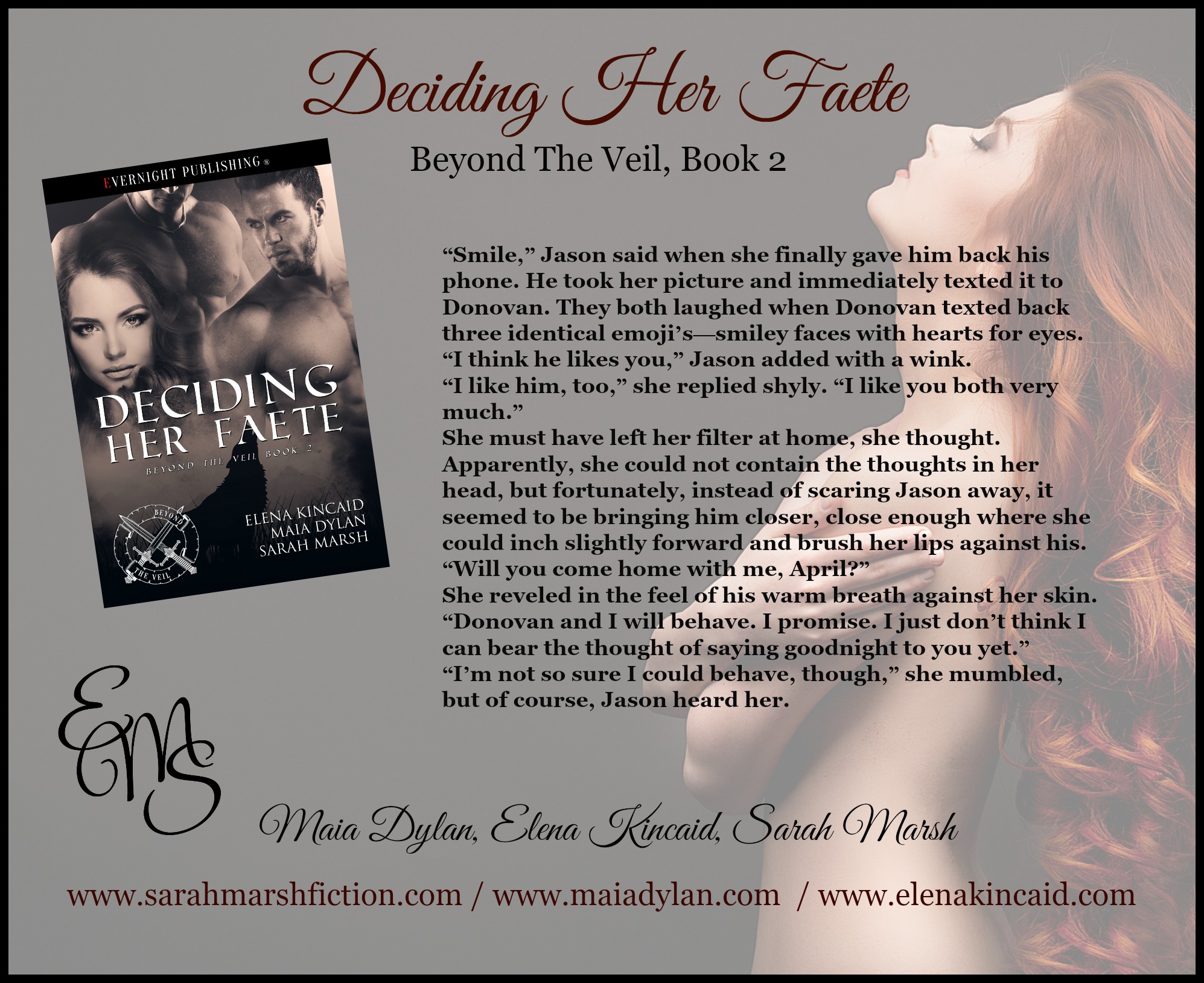 Thanks so much for hosting us on your blog today for the release of Deciding Her Faete, book number two in our ménage paranormal romance series. The Beyond The Veil series started out as a fun exercise in our Sinfully More Erotic Street Team group and we’ve had such a great time writing them! So far, we have 5 books planned in the series, but I wouldn’t be surprised if more sprout up along the way. All three of us fell in love with this mysterious world Beyond The Veil as well as our very overprotective Shifters on this side of the Veil.