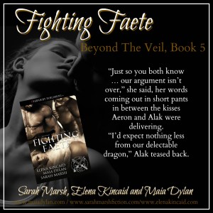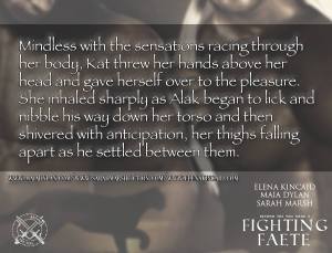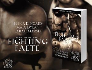 Fighting Faete is book number 5 in our Beyond the Veil series, and these characters are three of our favorites. Kat’s fierce independence combined with Alak and Aeron’s protective natures adds up to an explosive romance that Maia, Elena and myself had so much fun writing. We hope you enjoy them as much as we did!